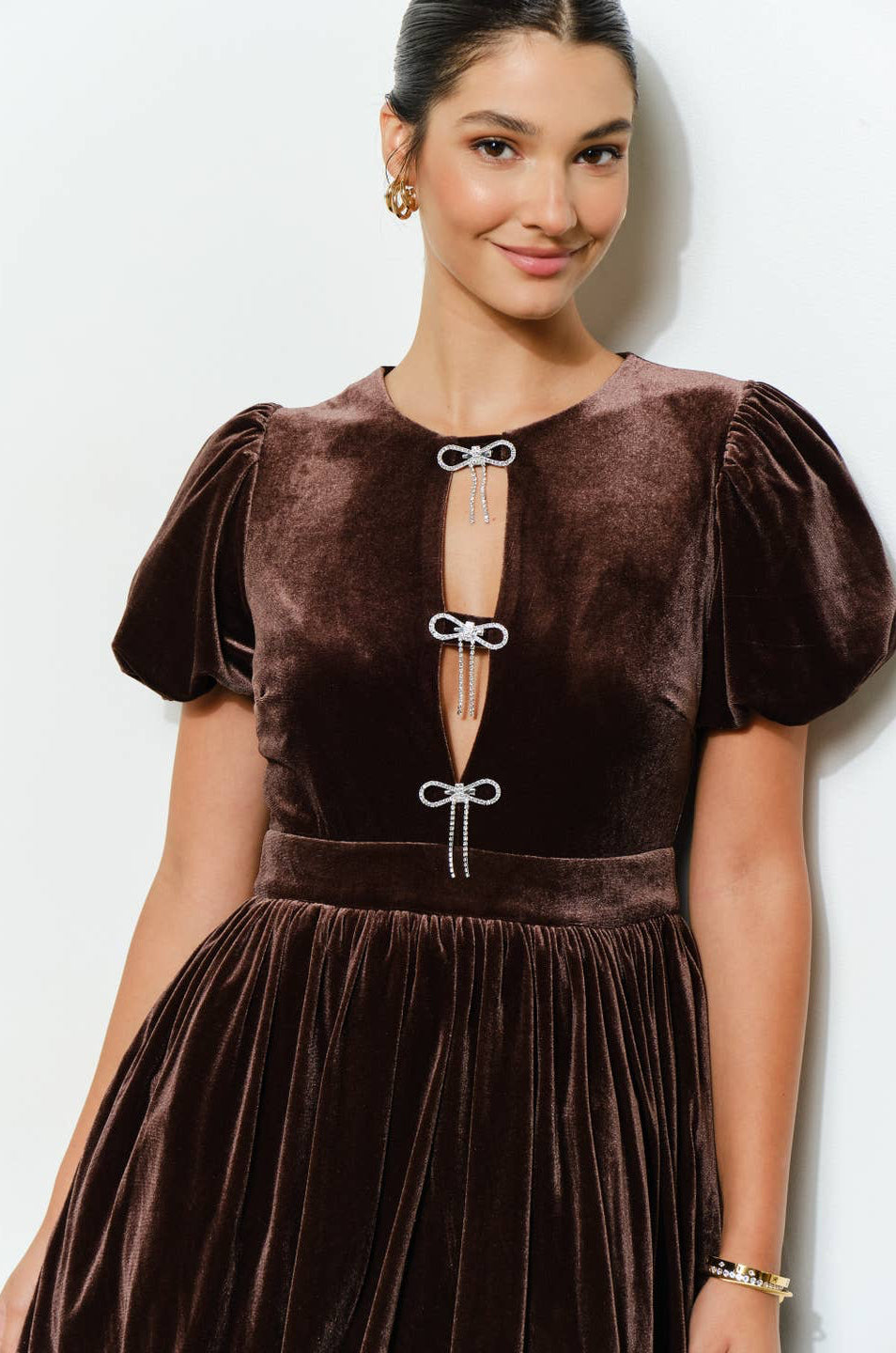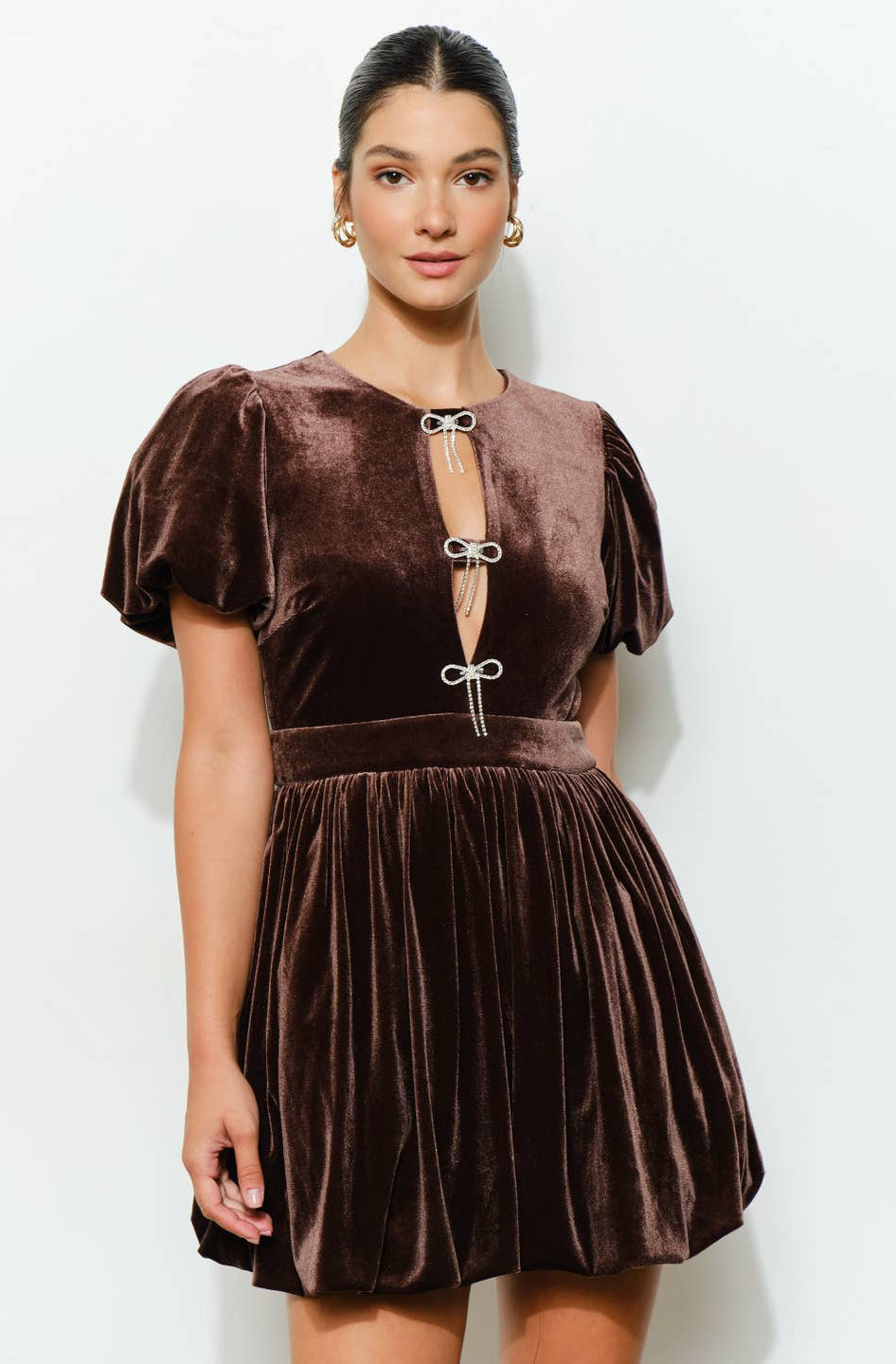 Unit price perVelvet Puff-Sleeve Bow Bubble Hem Mini Dress -Luxurious velvet mini dress with a soft sheen finish -Crystal bow accents highlight the keyhole front detail -Puff sleeves add volume and a romantic silhouette -Bubble hem skirt creates playful yet elegant movement -Hidden back zipper ensures a smooth fit -Perfect for holiday parties, evening events, or special date nights