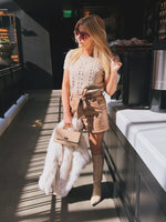 Unit price / perVegan, belted leather shorts that is high waisted with turn-up cuffs, patch pockets, zip fly, and button closure.