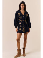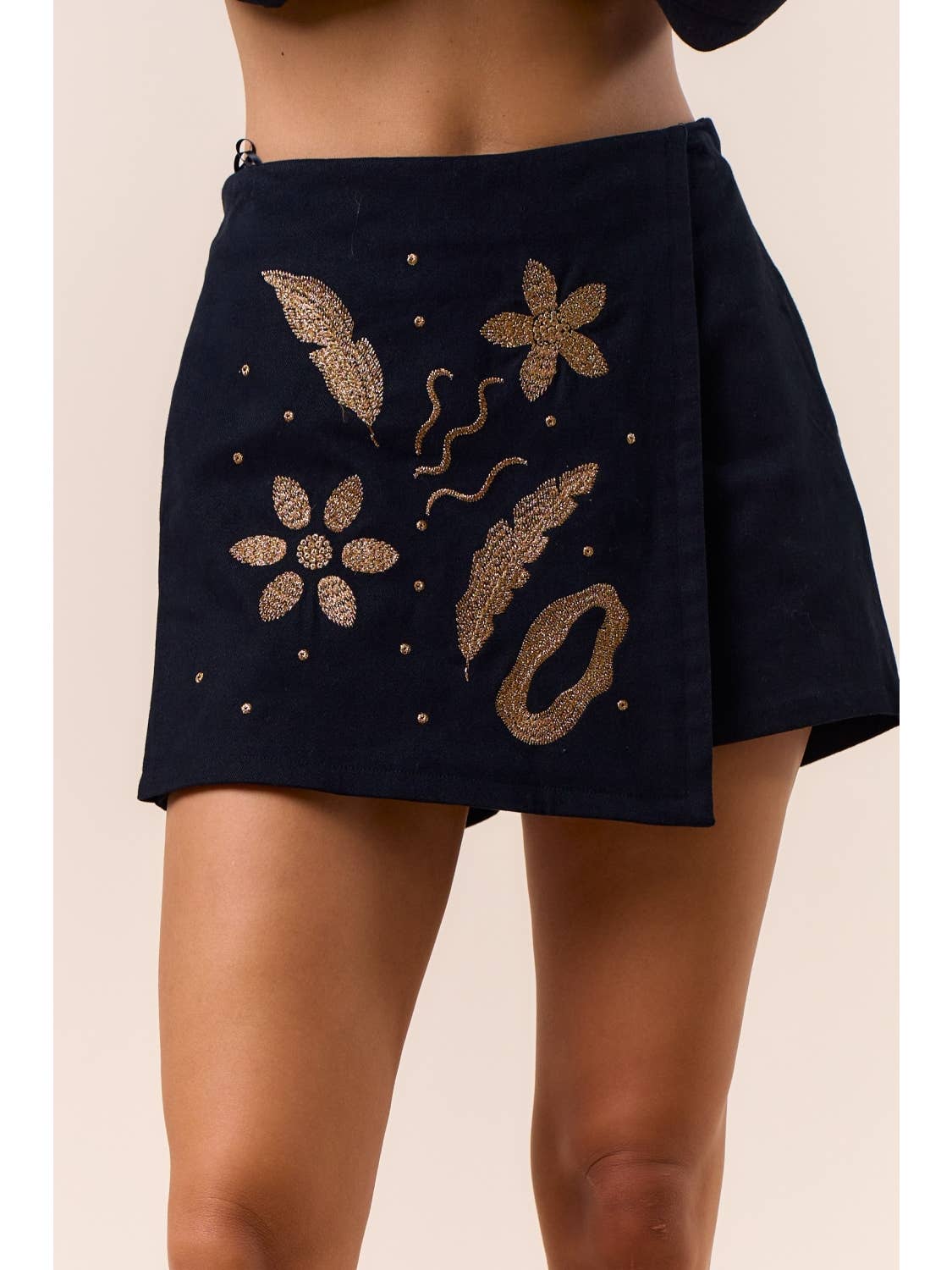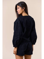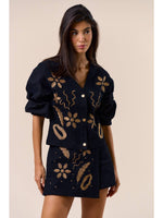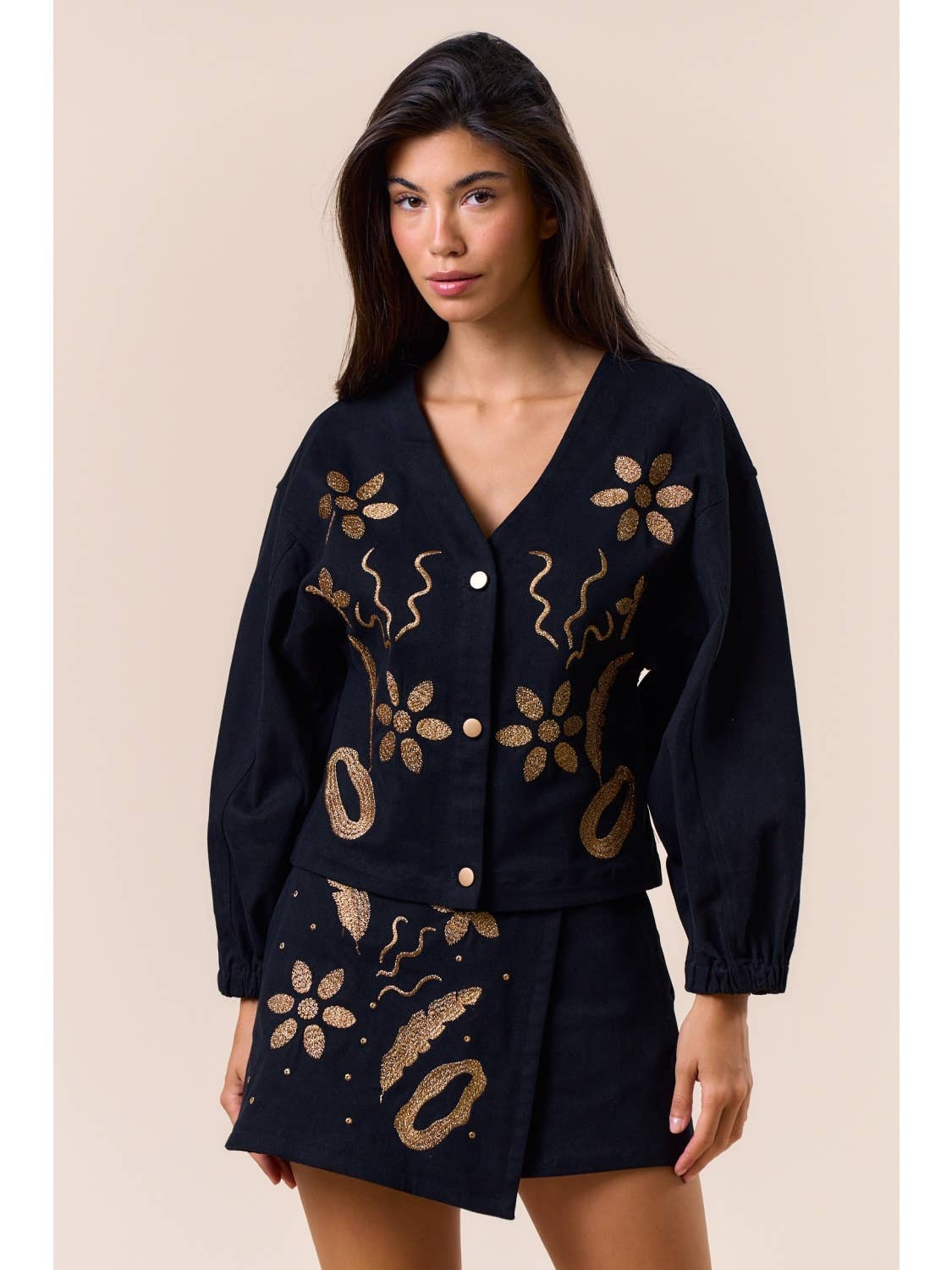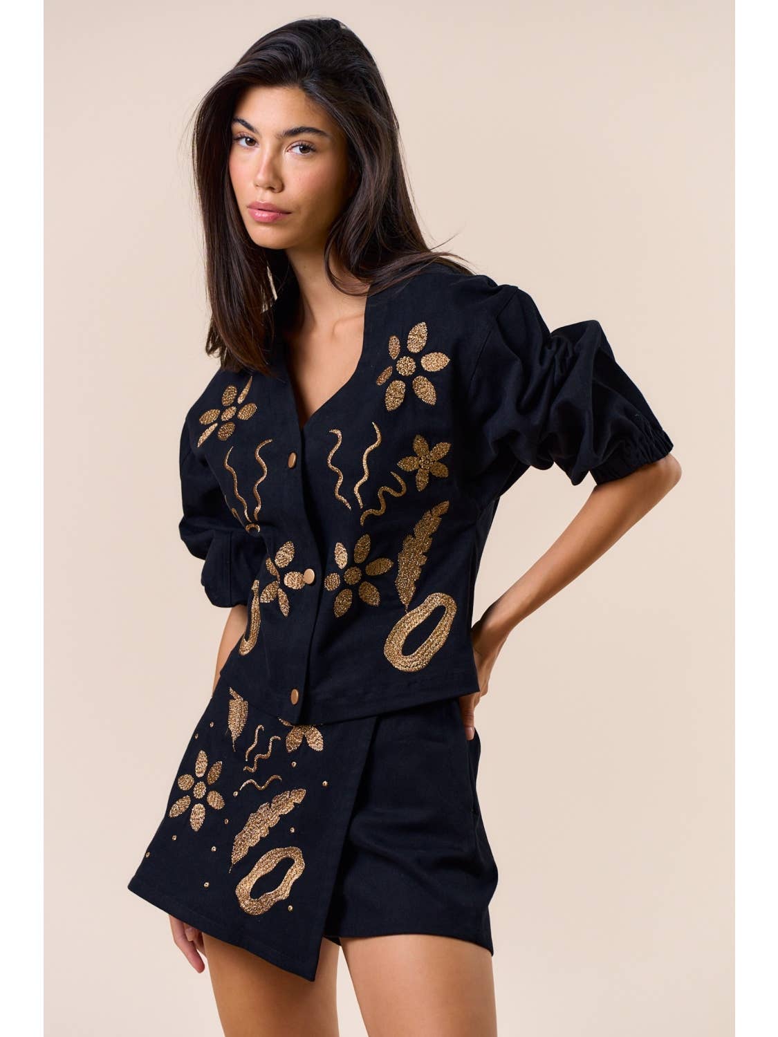 Unit price perElevate your style with this beautifully detailed black two-piece set, designed with intricate gold embroidery that adds richness and dimension to every look. The top features a soft V-neckline, statement sleeves, and chic front button detailing for a modern, feminine silhouette