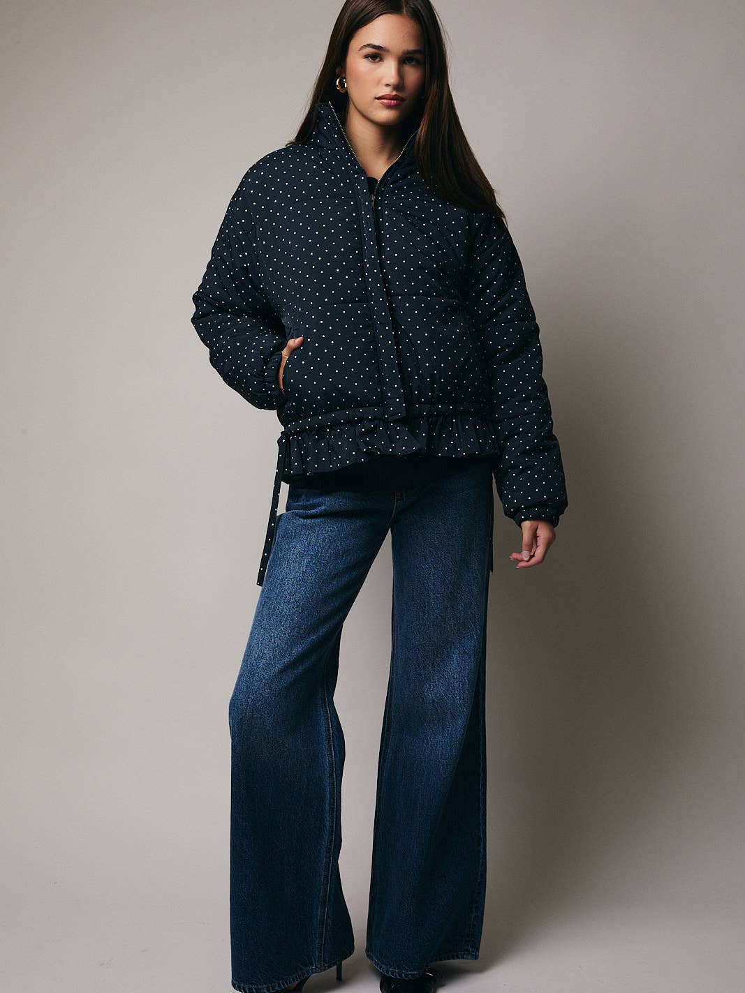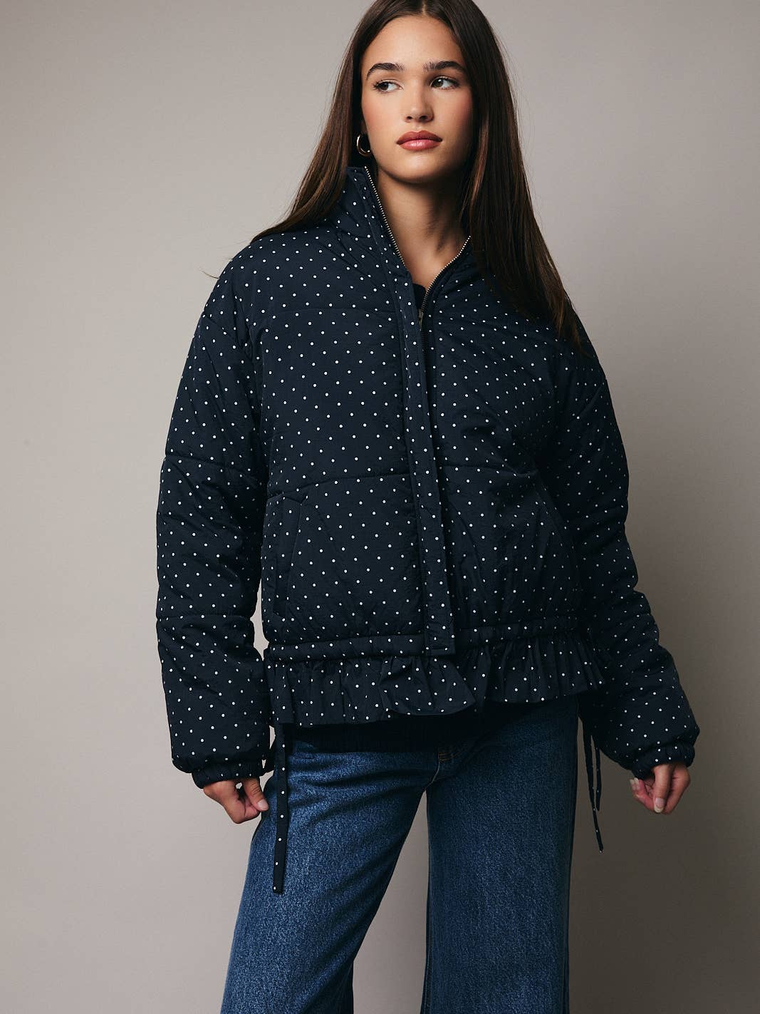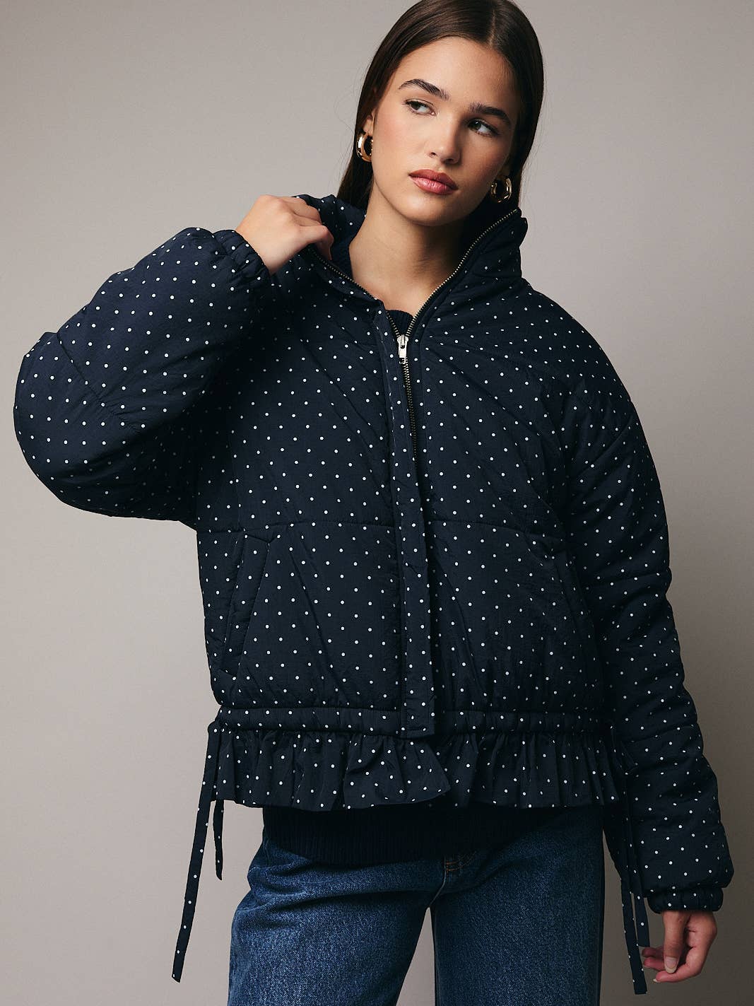 High Neck Long Sleeve Polka Dot Ruffle Detail Quilted Jacket
