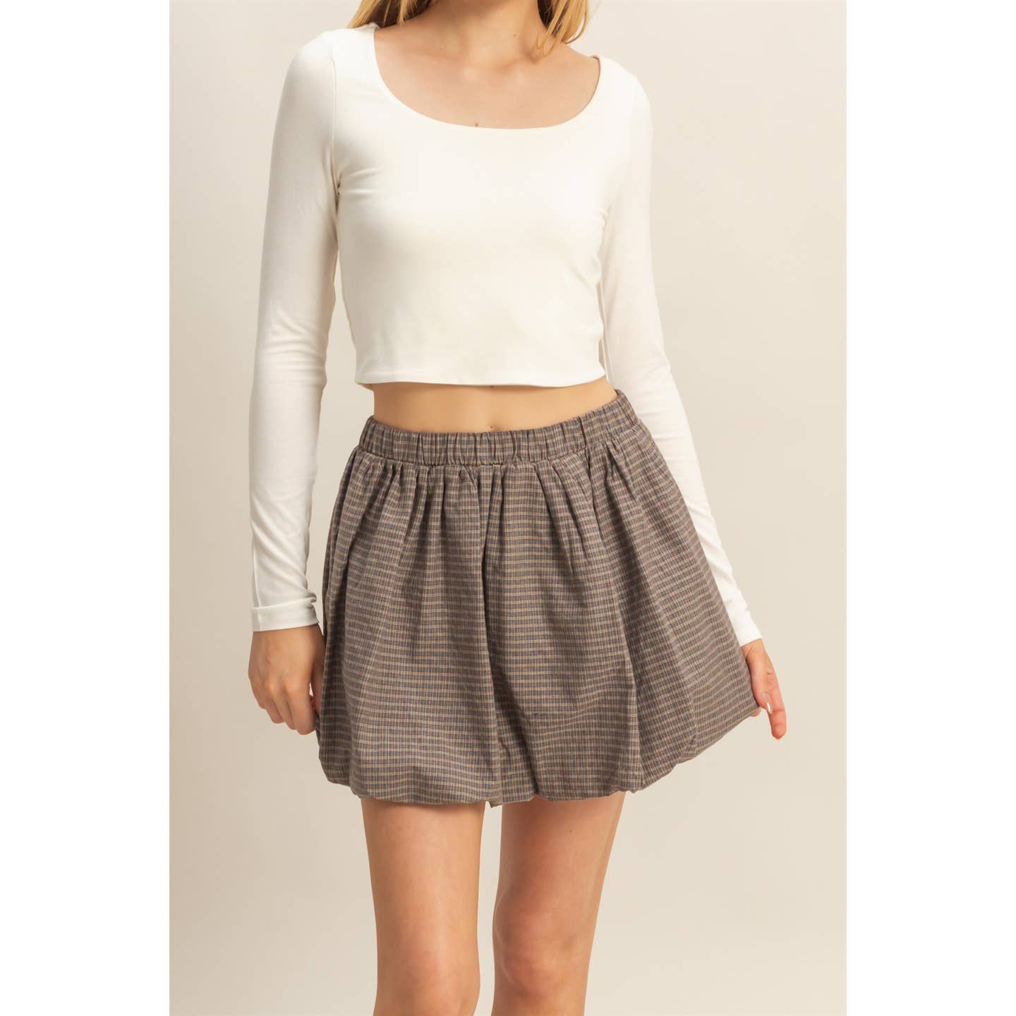 Unit price perPlayful, feminine, and effortlessly cool — this plaid bubble mini skirt is the ultimate fall staple. Designed with a soft, lightweight fabric and an elastic waistband for a comfortable fit, it features subtle pleats and side pockets for that perfect mix of style and practicality