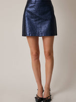Make a statement with this midnight metallic mini skirt, a perfect mix of sleek and sophisticated. Designed in a deep navy hue with a subtle shimmer finish, it catches the light beautifully while keeping a modern, structured silhouette.